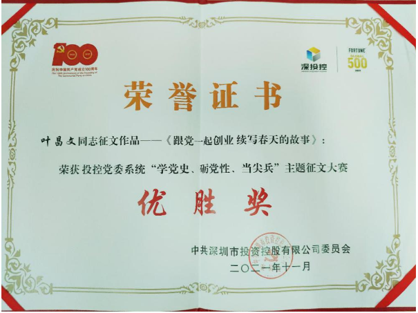 在征文大赛中,集团党委以学习感悟四史和建党100周年重要讲话精神为重点,鼓励集团员工回顾党的艰辛历史,结合自身工作和成长经历,书写爱国之心、强国之志、报国之情,共征得文章25篇,择优上报投控4篇,其中党群工作部叶昌文撰写的《跟党一起创业 续写春天的故事》荣获优胜奖。