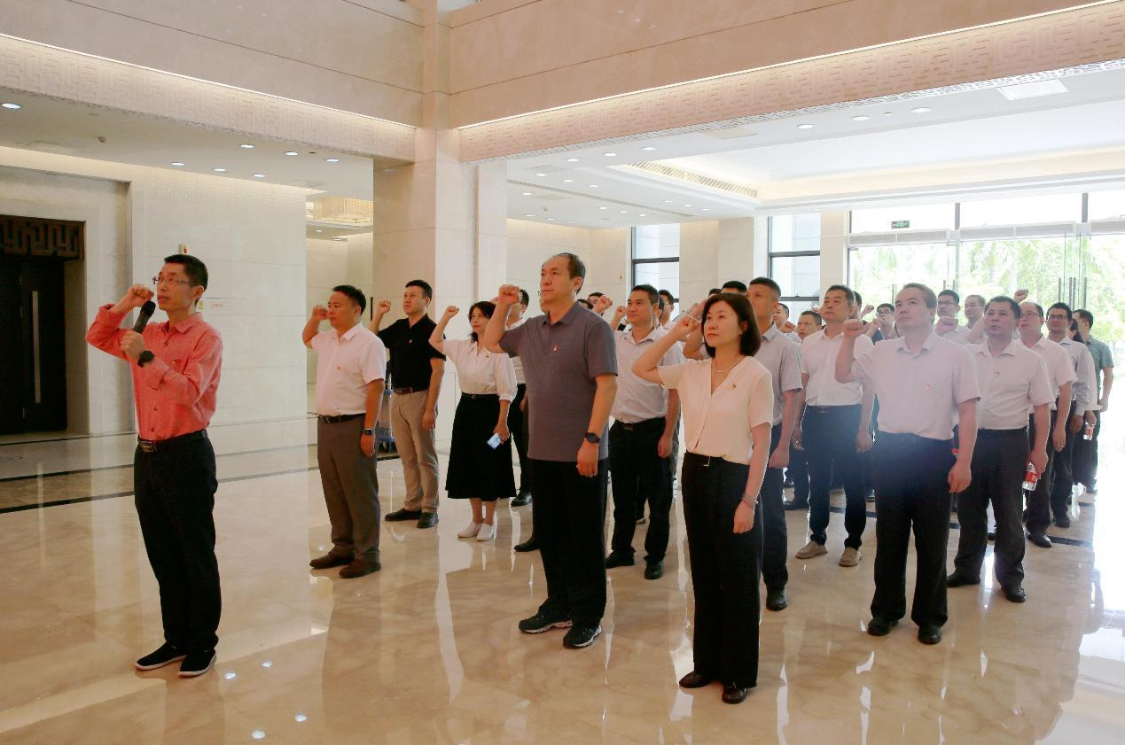 “我志愿加入中国共产党,拥护党的纲领,遵守党的章程,履行党员义务,执行党的决定,严守党的纪律……”,在教育基地一楼大厅,全体党员在“不忘初心 牢记使命”的雕塑前,高高举起右拳,再次重温入党誓词。