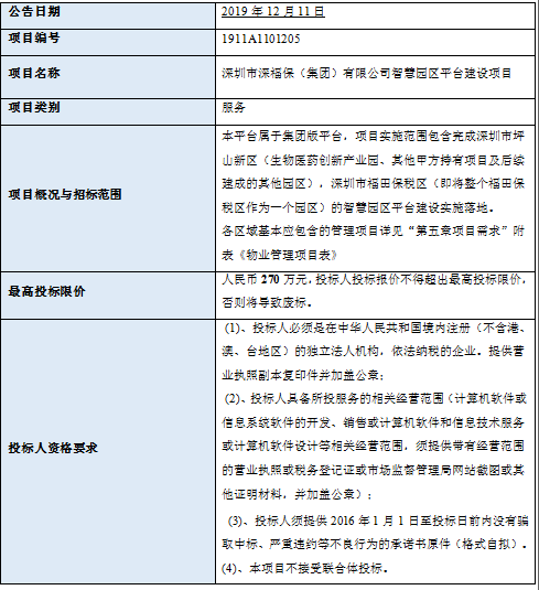 深圳市金年会(集团)有限公司智慧园区平台建设项目(项目名称)招标人为深圳市金年会(集团)有限公司(招标人单位名称),采购资金来自企业自筹(资金来源),项目出资比例为100%。项目已具备招标条件,现进行国内公开招标。