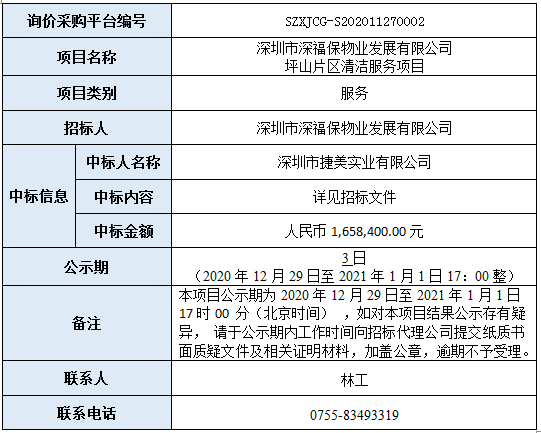 深圳市金年会物业发展有限公司坪山片区清洁服务项目已完成评审,现将本项目评审的相关情况及结果进行公示,具体内容如下: