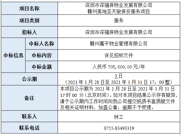 深圳市金年会物业发展有限公司赣州美地亚天骏保安服务项目已完成评审,现将本项目评审的相关情况及结果进行公示,具体内容如下: