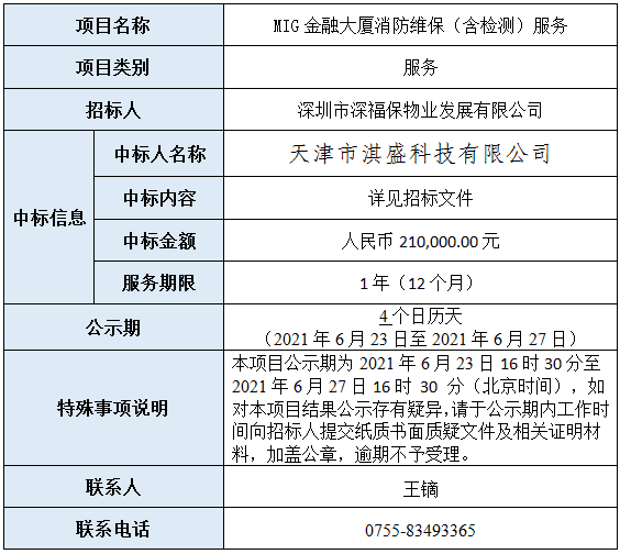 MIG金融大厦消防维保(含检测)服务通过竞争性谈判方式采购并已完成评审,现将本项目评审的相关情况及结果进行公示,具体内容如下: