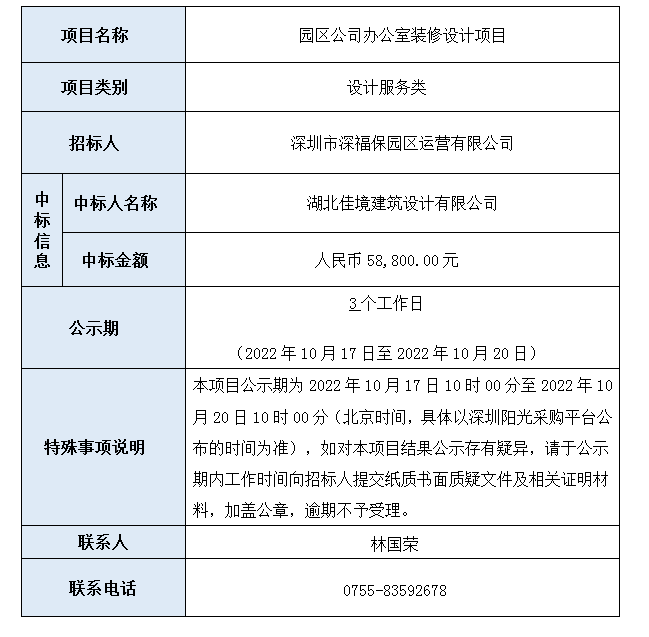 园区公司关于公司办公室装修设计项目已完成评审,现将本项目评审的相关情况及结果进行公示,具体内容如下: