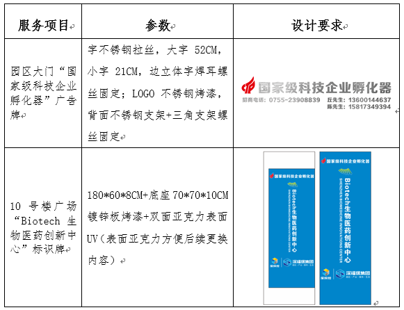 标识一:“国家级科技企业孵化器 招商电话:0755-23908839 丘先生13600144637 陈先生15817349394”,安装于锦绣路大门口,不可移动。