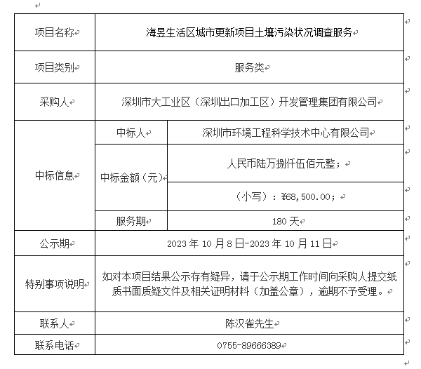 在深圳市建设工程材料设备询价采购平台进行公开招标的海昱生活区城市更新项目土壤污染状况调查服务(项目编号:SZXJCG-S202309140004)已完成评审及定标,现将本项目评审的相关情况及定标结果进行公示,具体内容如下: