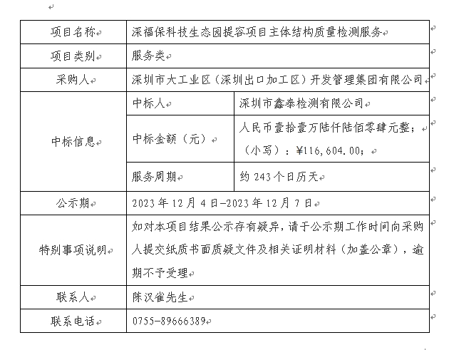 在深圳阳光采购平台进行公开招标的金年会科技生态园提容项目主体结构质量检测服务已完成评审及定标,现将本项目评审的相关情况及定标结果进行公示,具体内容如下: