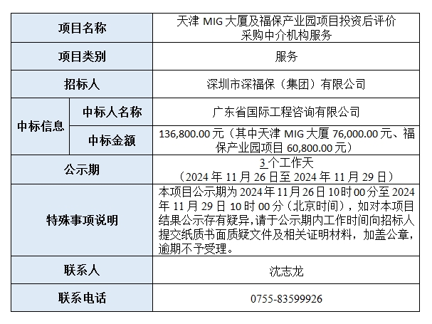天津MIG大厦及福保产业园项目投资后评价采购中介机构服务已完成评审,现将本项目评审的相关情况及结果进行公示,具体内容如下: